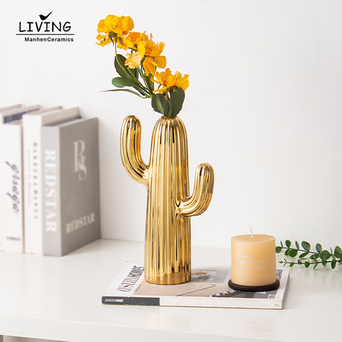 Venta al por mayor de cerámica dorada con forma de cactus vívido, jarrón de cerámica para decoración del hogar, adornos de mesa, florero artesanal de lujo